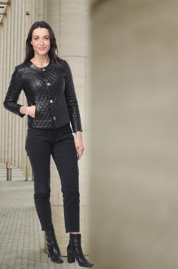 Sa coupe courte et cintrée souligne la silhouette avec élégance, tandis que ses pressions métalliques lui confèrent un caractère affirmé.